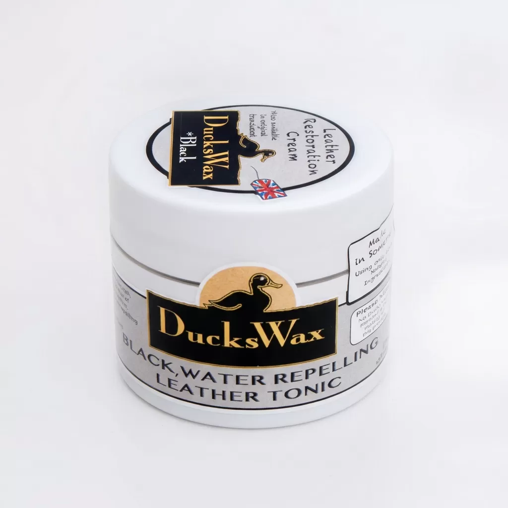 Ducks Wax black leather balm, helps restore colour to black leather plus soften and condition, apply with a soft cloth or sponge